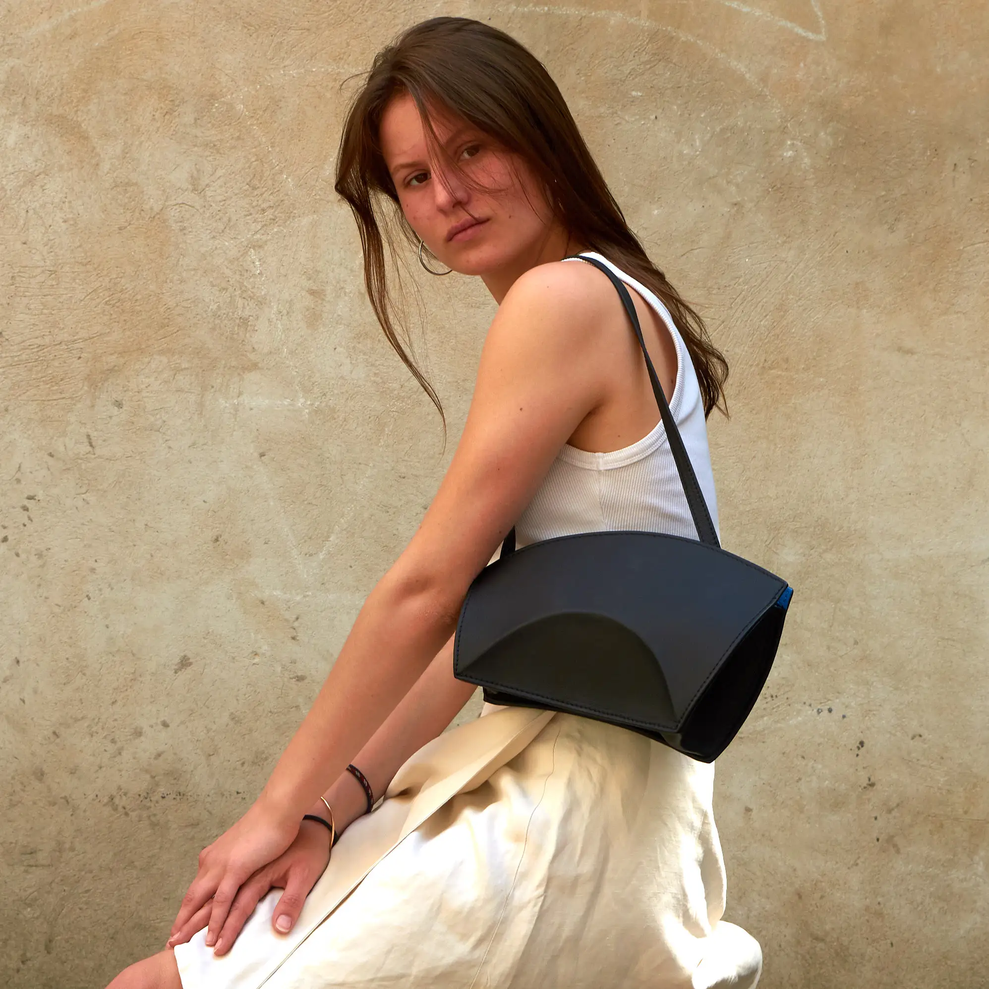 Highway, Handtasche. Als Clutch ergonomisch in der Hand liegend oder als Schultertasche sich an den Körper schmiegend. Auf dem Teetisch ein Objekt. Großzügige Öffnung mit Reißverschluss und abnehmbarem Trageriemen.